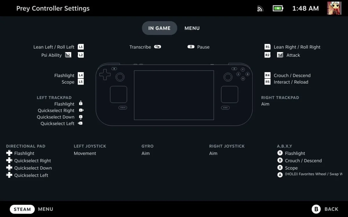 The control scheme of the Deck is unlike any other I have come across. At first, the touchpad idea sounded scary. We have seen this before on the Steam Controller – but, this is different. The touchpad controls were the most unexpected surprise for me. They function way better than the previous iteration and the capability ceiling is actually being utilized. They add variety to how you control the Steam Deck (for normal interactions) and the games you put on it. Stellaris would be not nearly be as fun on the small screen without them. In Stellaris, they act as a trackpad to a laptop, but in a more sensitive package. When necessary, they also act a d-pad when navigating menus in and out of the games. The joysticks have a similar feel in texture to the pads. If you have the device or if you are planning to purchase one, there is a feature demonstrated in Aperture Desk Jobs that lets you use the gyroscopic feature of the Steam Deck. I hope other games begin to take advantage of this technology in the future.